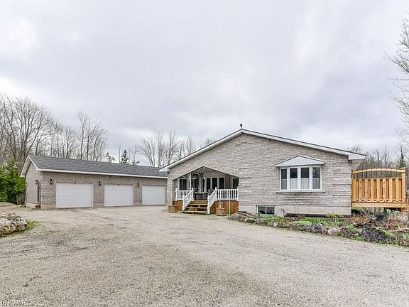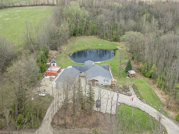 Work from home all year round, while you enjoy your own little piece of paradise and idyllic scenery. Beautiful custom built, all brick, 2455 square foot bungalow situated on 4 acres of lawn, mixed forest and walking trail - approximately 200' x 800'. Sit on one of your 3 private decks (over 1000 sq. ft), while you watch your children play in the 12' x 16' elevated play house, or listen to the tranquility of your large (100' x 80') spring fed pond - suitable for fish stocking. Car enthusiasts take note of the large ring driveway with plenty of parking and the 4 car (50' x 26') garage with in-floor heat. Hobbyists will also love the concrete pad behind the garage with 2 - 20' storage containers and one shed. Inside you will find an open concept, carpet free home with new hardwood flooring throughout the main level and tile in the bathrooms. Large, oak hardwood kitchen with built in lighted china cabinets, under cabinet lighting, built in knife board and formal dining area. Appliances included - built in wall oven, gas cooktop and Bosch dishwasher. Central vac with kitchen vacuum sweep. Two high efficiency wood burning fireplaces (main floor and basement). Three bedrooms, including a spacious master bedroom with 5 piece ensuite. Quality 2 x 6 exterior construction, R20 and R40 insulation. Paved road and fibre optic cable is available at the street. Attention to detail and quality finishes must be seen to be appreciated.