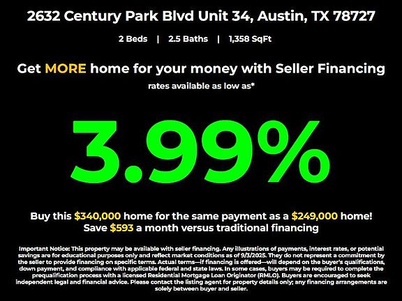 Buy this $340,000 home for the same payment as a $249,000 home! MAXIMIZE YOUR BUYING POWER with exclusive seller financing! Well qualified buyers can lock in rates from the mid-4's to mid-5's, depending on down payment, and save up to $8K in closing costs. Minimum 10% down payment. All buyers must be pre-approved through a licensed RMLO to be considered. No formal underwriting, no discount points, close in as little as 14 days. Craving peace and quiet with the convenience of city living? This move-in ready end-unit condo offers the best of both worlds. Tucked away at the back of a well-maintained, established community, this home feels like a private retreat — yet you're just minutes from The Domain, Q2 Stadium, and major roadways like Mopac and I-35. Seamless access to the city is just across Mopac thanks to the Howard Lane train station. Inside, fresh paint from floor to ceiling and updated flooring in the main living areas give the home a clean, modern feel. The thoughtfully designed floor plan features a spacious living room, dining area, kitchen, and powder bath downstairs. Upstairs, the generous primary suite includes a versatile flex space — ideal for a home office, reading nook, yoga room, or TV den — plus a second bedroom and full bath. This home has been lovingly cared for and is truly low-maintenance, offering peace of mind for first-time buyers, downsizers, or anyone simply looking to enjoy their home without a long to-do list. A private, fenced backyard is the cherry on top — perfect for your morning coffee, weekend lounging, or giving your furry friend a place to play. All of this is located within the highly sought-after Round Rock ISD, while still enjoying the benefits of Austin property taxes — a rare and valuable combination. End units like this don’t come around often — quiet, private, and close to everything. Come see for yourself!