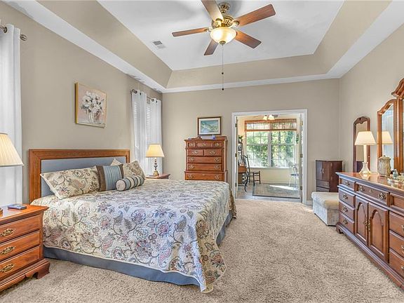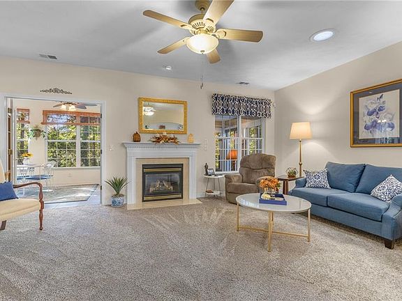 Popular ranch floor plan with cheerful sunroom, screened porch, and 2 car garage overlooking lush lawn with pretty lake views. Lovingly care for and thoughtfully upgraded open concept floor plan with 10’ ceilings throughout. The kitchen features a breakfast bar, tile backsplash, and stainless steel appliances (age?). Dining area leads to the great room with cozy gas fireplace. Large primary suite with two closets, and en suite bath. HVAC and hot water heater (Age). Flooring?, ceramic tile baths and wood laminate floors in foyer, hall, & dining room. Laundry rm with washer/dryer (?). Remodeled screened porch (view?) Relax & enjoy the good life in this sought-after 55+ community w/ fitness ctr, clubhouse & pool designed to deliver an unparalleled luxurious lifestyle at an affordable price!