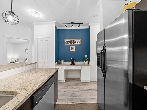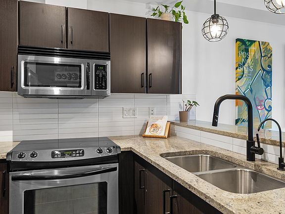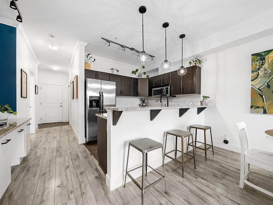 Bright and modernOpen-concept layoutKitchen features granite countersStainless appliancesPendent lighting accentsPrivate balconyMountain views