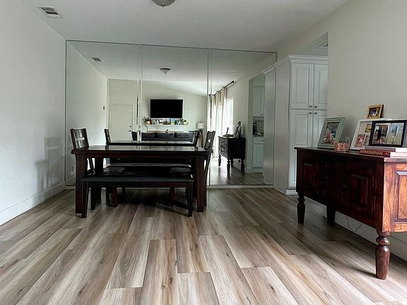 Nestled at the heart of the close-knit Village San Juan community, this private end unit 3-bedroom floor plan has undergone a stylish modern makeover that maximizes natural light. You'll find updates galore, from the sleek kitchen cabinets, countertops, and flooring, to the inviting shutters, fixtures, and newer windows that flood the space with an abundance of natural light. The roomy living area boasts a fireplace, creating a cozy yet bright ambiance, while the dining space is accentuated by a mirrored wall that further amplifies the space.