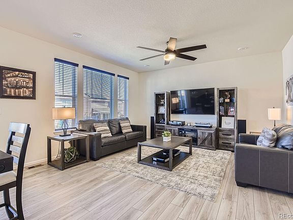 The upper floor has three large bedrooms, two baths and the laundry room. This home has an unfinished basement for your creative and/or future expansion needs. The privacy fence has been stained and the home is waiting for it's new owners. It's also has a new roof! Adonea has it's own walking trails, neighborhood parks and a community pool along with a large clubhouse. This home it just a short drive to DIA or Buckley Air Force. E470 and I70 make it easy to get around town. Solar system is leased.