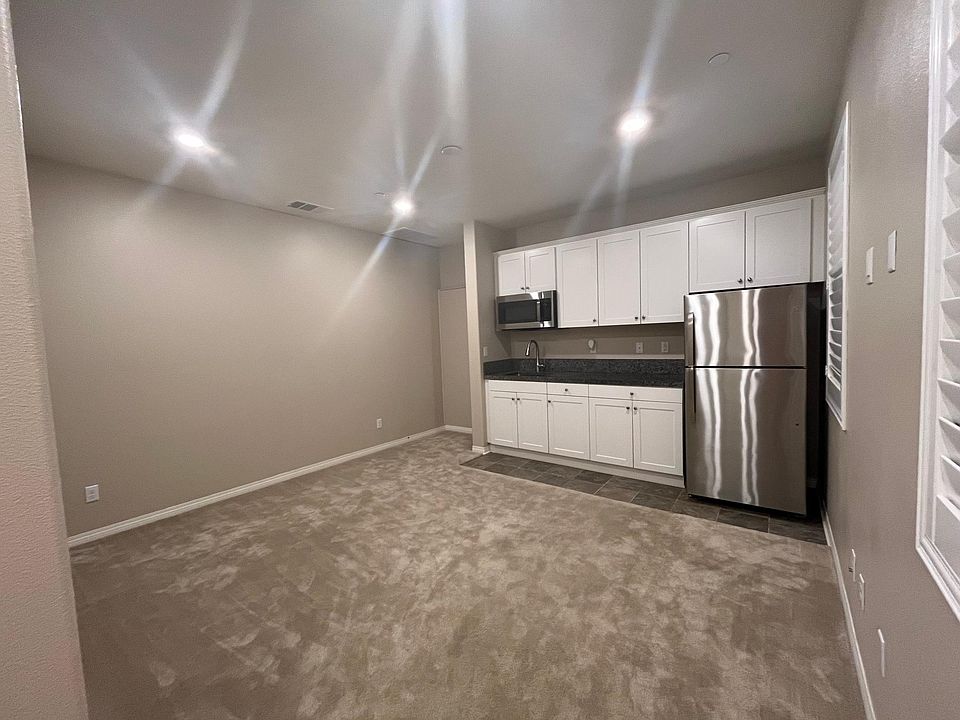 Kitchenette: microwave/oven combo, refrigerator, sink with garbage disposal. No stove, but landlord will provide countertop stove w/ 2 burners.