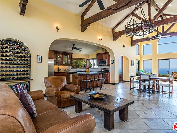 For information please contact Listing Agent Brian Merrick 310-317-8373 or Malibubeach@realtor.com Situated on a knoll top with outstanding ocean and glorious mountain views from every angle rests this 4 bedroom, 4 bathroom Malibu modern Tuscan style property . This well constructed home boasts an open floor plan with Cathedral wood beamed ceilings, a grand fireplace and gorgeous wrought iron detailing throughout. Featuring granite kitchen, wide planked hardwood flooring and custom finishes, this private and peaceful property entices with lush landscaping and several outdoor entertaining areas to choose from. Property includes 3 legal parcels, including a working vineyard, a 2 car detached garage, Santa Monica bay and city lights view complete this special property.