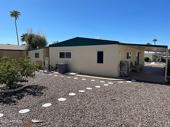 This manufactured home in the Adult Golf community of Apache Wells is a great opportunity for a full time occupant, part year resident or investor. It is a 2 bedroom and 2 bath with a side porch next to an easy to maintain yard. It also has a convenient storage room that is located at the end of the covered carport that houses the washer and dryer along with plenty of additional space for seasonal belongings or tools.