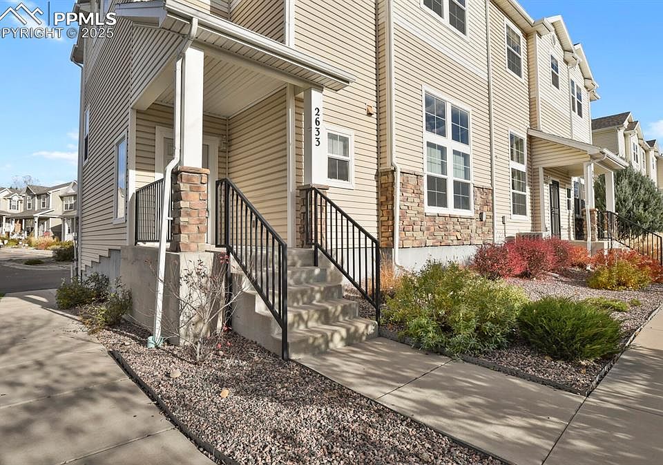 Welcome to this beautiful 2-story end unit property , a light-filled 3-bed, 3-bath townhome offering nearly 1,900 sq ft of refined living space in a peaceful, well-connected community. From the moment you enter, you’ll feel the energy: vaulted ceilings, abundant natural light, and an open-concept main level designed for connection. The kitchen shines with stainless-steel appliances, plenty of cabinetry, and easy flow into the family and dining spaces — perfect for weeknight dinners or entertaining friends. Upstairs, your primary suite retreat features a private bath with dual vanities, a walk-in closet, and space to unwind. Two additional bedrooms and a full bath offer flexibility for guests, family, or a dedicated office. Step out to your private balcony, sip your morning coffee, and soak in the Colorado sunshine. The oversized two-car garage adds plenty of room for cars, bikes, and mountain gear. Set in Southeast Colorado Springs, you’re just minutes from parks, shopping, and commuter routes — with the quiet and comfort of home waiting every evening.
