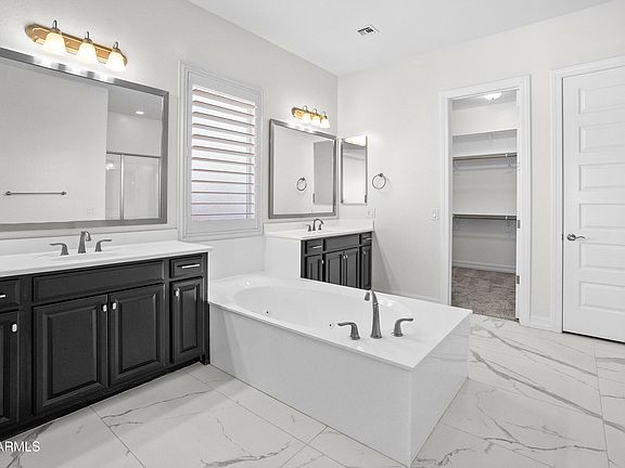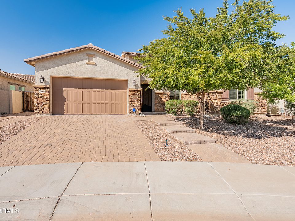 Located in the exclusive gated community of Stonebridge, this stunning home offers elegance, privacy, and modern comfort. Situated on a quiet cul-de-sac with no neighbors behind, it's just minutes from premier shopping, A-rated schools, and freeway access. Enter through a spacious covered courtyard into an open, beautifully designed interior featuring custom modern tile flooring (excluding bedrooms) and plantation shutters throughout. The home boasts 4 bedrooms, 2.5 bathrooms, a flex room, and a formal dining area, providing space for both relaxation and entertaining. The gourmet kitchen showcases sleek black cabinetry, granite countertops, a custom backsplash, double ovens, gas range, and a walk-in pantry, with a cozy breakfast nook nearby. The luxurious primary suite features a tray ceiling with crown molding, and a spa-like bath with dual vanities, a center soaking tub, walk-in shower, and expansive walk-in closet. Three additional bedrooms connect through a versatile flex space, perfect for a playroom or home office. Step outside to a resort-style backyard with an extended travertine patio, lush turf, mature landscaping, and a raised pergola with built-in grill and sinkideal for entertaining. A 2-car garage with built-in storage completes this exceptional property.