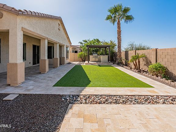 Extended travertine patioLuxurious primary suiteLush turfDouble ovensCustom modern tile flooringWalk-in pantryCozy breakfast nook