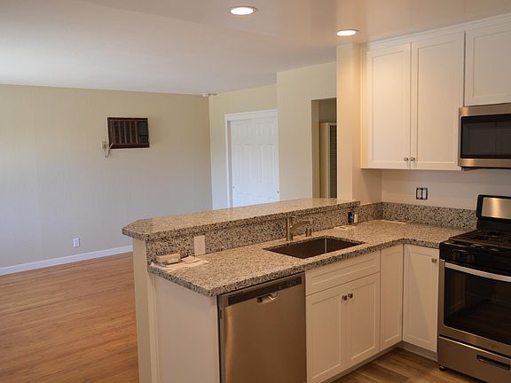 Nicely updated with new kitchen and bath. Includes new cabinets, granite counters, recessed lighting, kitchen flooring and appliances. Bath includes new tub shower, toilet , vanity and flooring. All work completed with city permits. Raised panel doors, dual pane windows, large patio area, room for gardening (if you like) laundry in unit and 2 parking spots (one covered). Close to BART, downtown, shopping, trails and Larkey Park. Easy commute location. Prospective tenant shall see property prior making application. Owner pays water and garbage