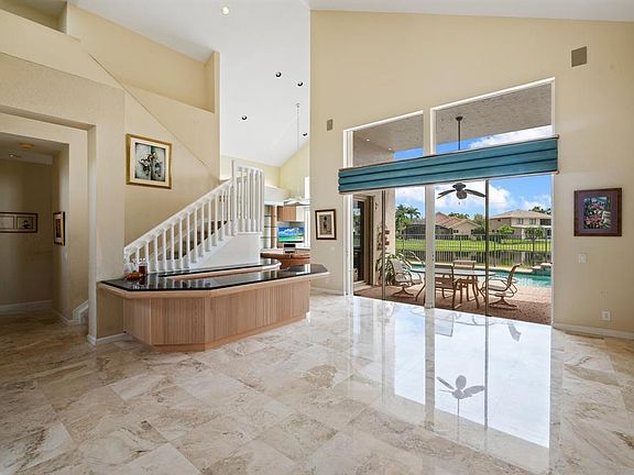 Discover a truly unique and first-time offered waterfront pool home nestled within a serene half cul-de-sac in a premier golf course community. This exquisite residence boasts high volume ceilings that amplify its sophisticated charm and expansiveness, while marble floors lend an air of timeless elegance throughout the living spaces. Upgraded kitchen featuring modern appliances, custom cabinetry, granite countertops & breakfast area. The main bathroom has also been meticulously upgraded, offering a luxurous spa tub, spacious walk-in shower & elegant fixtures. Step outside to the beautifully designed pool area, where tranquil waterfront views enhance the beauty of outdoor living. New Roof 2020, New A/C 11/2023, House Water Purification System & a Classic Knotty Pine Dry Sauna in 3rd bath.