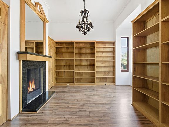 Built-in bookcasesGravel landscapingLaminate flooringMature treesTongue-and-groove and beam ceilings
