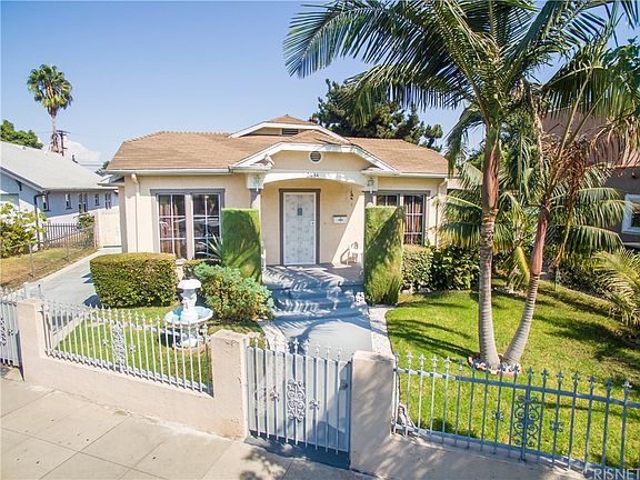 Motivated Seller!! This California Bungalow was built in 1923 with craftsman construction & is located in the West Adams neighborhood of Los Angeles. The front yard's ornate wrought iron fence, lush landscaping, manicured shrubs, and swaying palm trees enhance its eye-catching curb appeal. The custom front door opens to a flowing 1,576 square foot floor plan with a complementary designer paint scheme and striking architectural accents . The spacious living room is bathed in natural light which emphasizes the mantled fireplace, flanked by deco wall sconces, engineered hardwood flooring, and smooth ceiling with recessed lighting. The family's cook will appreciate the kitchen's large garden window, ample Corian counters, abundant cabinets, dual basin stainless steel sink, handy breakfast bar, easy care tile flooring, & the convenience of the adjoining formal dining room with elegant chandelier, and a beautifully appointed built-in china cabinet with accent lighting. 4 spacious bedrooms. Both of the spacious contemporary bathrooms are sumptuously appointed with ample cabinets and linen drawers. Laundry room with ample storage, copper plumbing, Upgraded electrical, floor and roof framing have been reinforced and insulated. Spacious backyard with a tall privacy fence, lush landscaping, and large checkered concrete patio. The 40+ foot driveway provides plenty of off street parking behind the rolling security gate, the detached garage has been tastefully converted into living space.