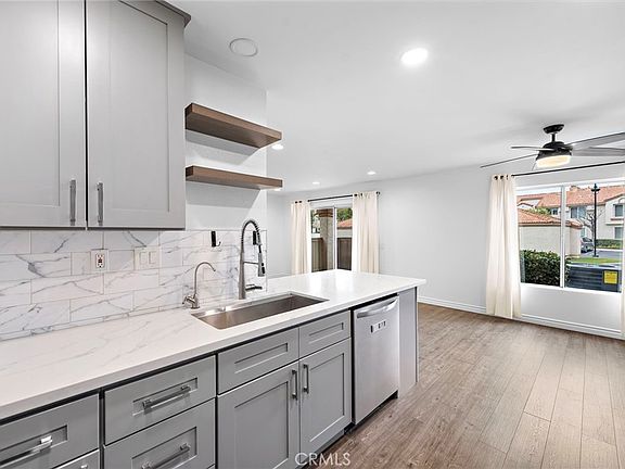 This is the turn-key home you have been waiting for! Situated behind the gates of the Villorio community, this newly upgraded home is just down the street from the adorable shops and eateries of Foothill Ranch. As well, it is centrally located between the 5 freeway and the Eastern Transportation Corridor for an easy commute! This end-unit condo has been remodeled from top to bottom. Just some of the upgrades include: new laminate flooring; quartz countertops and modern tile throughout the home; a fresh coat of paint; recessed lighting; cabinets and hardware; ceiling fans and more! This condo is perfectly situated in the community with no other units directly in front of you. Instead, you have a wide open view of the greenbelt and your beautiful community. This home won't last!