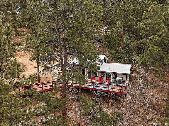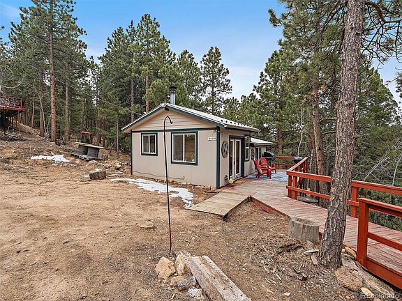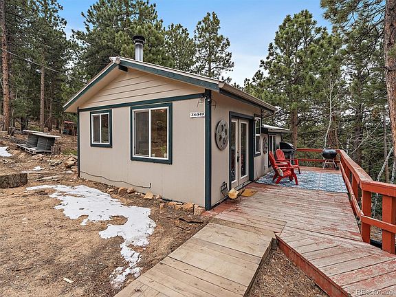 Full time, year round living. The front deck leads to modern French doors that open to a light and bright cabin. Featuring vaulted ceilings, recessed lighting, textured walls and multiple dual pane windows. Spotless laminate wood floors throughout. The open kitchen has ample cabinet and counter space, microwave, fridge and oven. A cozy wood stove keeps this cabin toasty on the coldest days. And electric baseboard heat too. The bedroom has plenty of room and the 3/4 bath is beautifully done. A separate closet holds the washer and dryer. Other features include a storage shed and plenty of room for parking. Metal Roof. Set in an enclave of small mountain homes with both privacy and neighbors. Excellent location! Just 5 minutes to Hwy 285. Less than 10 minutes to Safeway, Staples, Starbucks, Restaurants, shops and more. This charming cabin is a must see!