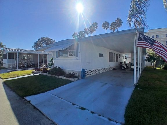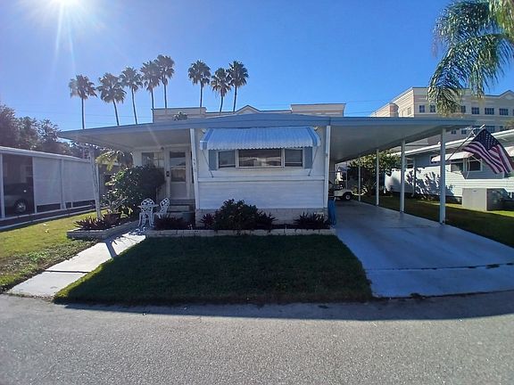 Step into this charming two-bedroom home featuring one full bath and an additional half bath, located in the premier 55+ community of Bayside Waters. This fully furnished home includes a golf cart, washer and dryer, a range top stove with a double oven, and a Florida room addition that serves as an extended living area. The central A/C was replaced in 2020, and the TPO roof has been recently resealed for peace of mind. Outside, you'll enjoy a spacious carport that fits 2-3 vehicles and a relaxing back patio. Bayside Waters offers resort-style amenities including a heated swimming pool, hot tub, clubhouse, fitness center, billiards room, library, shuffleboard, and pickleball courts. Nestled along Old Tampa Bay, the community is just minutes from shopping, dining, and the beaches, providing the perfect blend of comfort, convenience, and coastal living. Monthly lot rent is $1,030.00