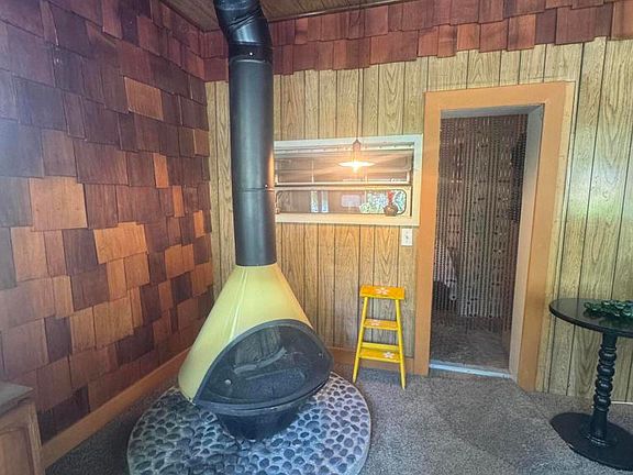 Step into timeless charm with this beautifully preserved 1958 vintage trailer-where mid-century style meets modern comfort. This one bedroom with a bonus sleeping space; features a spacious living area welcoming you with a warm, inviting ambiance, highlighted by a striking vintage wood-burning Malm fireplace at the heart of the home. The retro kitchen features classic vintage appliances, perfect for preparing meals while embracing the nostalgia of yesteryear. A built-in circular dining nook creates the ideal space for gathering with friends and family. Enjoy the outdoors from the inviting front deck or retreat to the serene, fully fenced backyard-perfect for relaxation, entertaining, or simply soaking up the peaceful surroundings. This rare gem in Royal Pines Estates offers an estimated space rent of $675/month, which includes access to the swimming pool, clubhouse, and laundry facilities. Located close proximity to town and to scenic hiking trails, this home offers both convenience and a nature-filled lifestyle.
