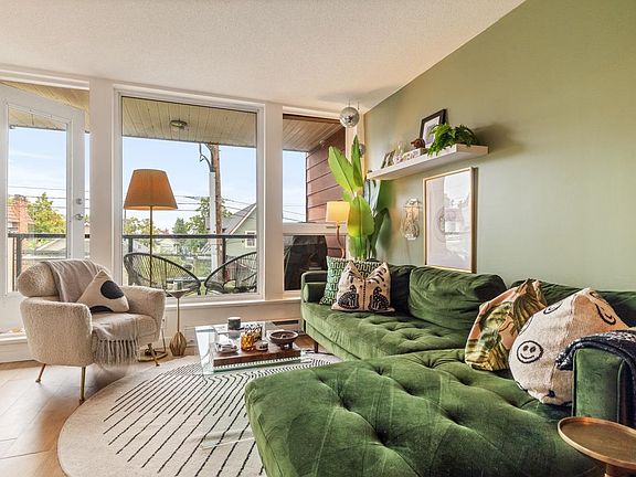 This stylish & functional CONCRETE apartment with incredible storage is nestled peacefully above the treetops, in one of East Van's most vibrant locations! The tastefully upgraded, south-facing layout shines bright with an open plan, glass walls, private balcony & views to the vintage homes surrounded in lush trees beyond. The spacious entry foyer with flex room & charming solarium/office are appreciated by all. Chef's kitchen with granite counters, formal dining space & vibey living room are perfect for parties & relaxing alike. The gorgeous wide-plank floors, designer lighting, newer appliances, in-suite laundry & ensuite bath compliment this unique & luxurious space. +2 MASSIVE STORAGE LOCKERS! Great building in prime, booming location near shopping, parks, transit, beach & PNE events!