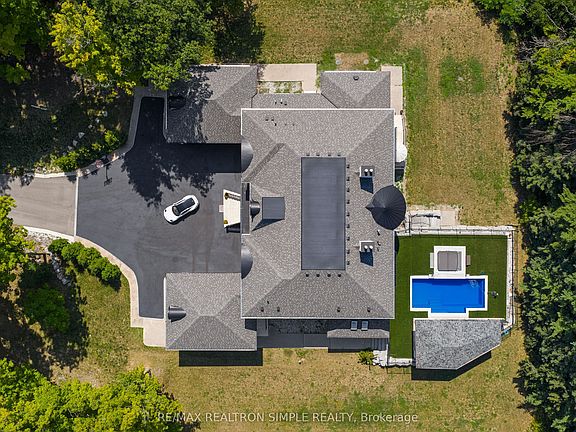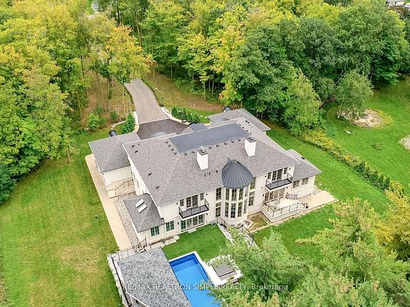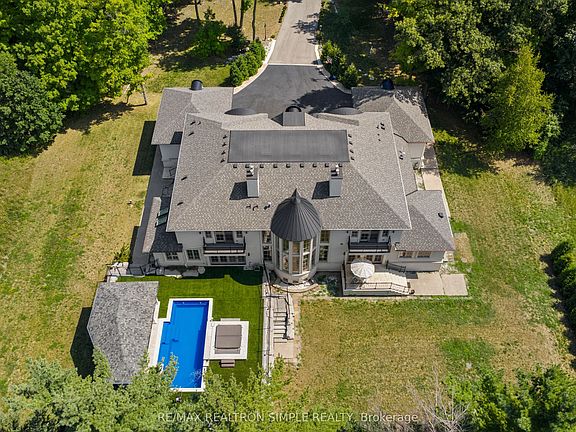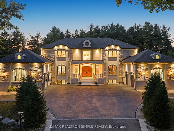 Set on 2.4 acres atop Burlington's Bluffs, this gated stone-clad estate offers more than 11,000+ sq. ft. of living space, uniting enduring strength with graceful design. Built to endure for generations, it blends permanence with refined elegance. Among its discreet luxuries are two pools one basking beneath the open sky, the other sheltered indoors creating a rare duality of year-round leisure. Inside, the drama begins in a soaring 21-foot ceiling foyer, framed by a sweeping double stairwell that sets the stage for the grandeur within. A private elevator connects all levels, complementing the six-zone heated flooring that carries comfort through every room. A dedicated media room provides the perfect retreat for cinematic nights at home. Every detail, from bespoke finishes to silent floor design and reinforced construction, reflects a vision of permanence and sophistication revealed room by room. Framed by an abundance of mature trees, the property balances privacy with convenience, moments from the city's best amenities.