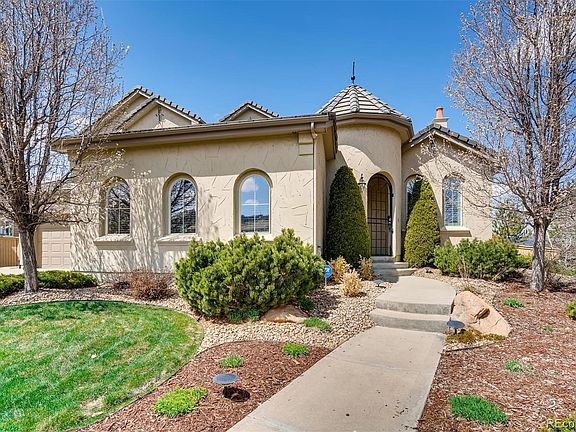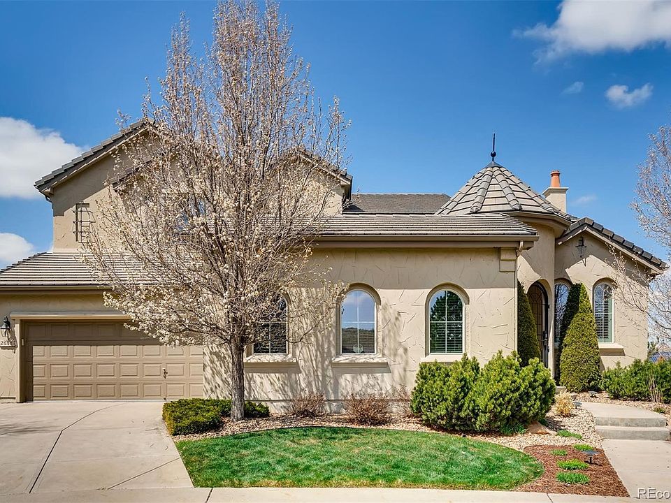Views, views, views! Exquisite home with private courtyard at the end of a cul-de-sac with distinctive architectural features. Including an impressive vaulted foyer with grand staircase. Formal dining and and living room with cozy gas fireplace. Private home office with plantation shutters. Unique mezzanine level - perfect for highlighting your grand piano or artwork. Large kitchen with copious cherry wood cabinetry, stainless steel appliances, double ovens, eat-in area, and two-sided fireplace. Retreat to the huge master suite with unparalleled city and mountain views - simply must experience for yourself! Fully finished walk out basement with wet bar, family room, game room, bedrooms, and bath. Large laundry / mud room. Private enclosed patio. Great location with short drive to shopping, golf courses, C-470, and all the great Highlands Ranch amenities. Literally too many details to list - this is the one you've been waiting for - don't let this one get away!