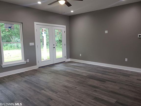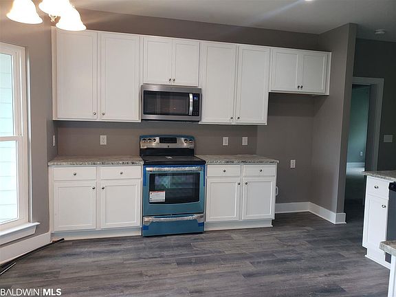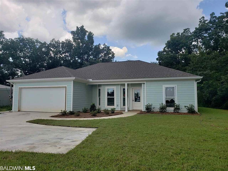 Brand NEW construction. GOLD FORTIFIED! Energy saving features. This hardboard split bedroom plan is cozy yet spacious. Enter the home through the covered porch and into the foyer there is an eat-in kitchen that opens to a larger living room with cathedral ceiling. The kitchen has stainless steel appliances, and a breakfast bar. All living area flooring will be vinyl plank. There is a rear covered patio great for grilling. The master suite has a walk-in closet and master bath with dual vanities, walk-in shower, and water closet. The utility room is also on this side of the house and entry to the 2-car garage. This split floor plan offers 2 guest bedrooms and bath with tub/shower on other side of the house. Concrete driveway. Partially fenced yard. Conveniently located just east of Elberta township, schools and restaurants. Short drive to Pensacola, I-10 and the beautiful Gulf Coast beaches.