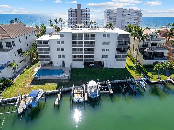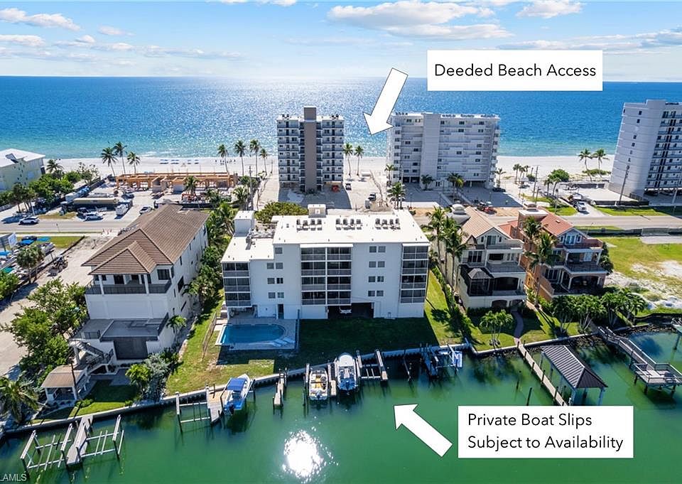 Beautiful END-UNIT with spectacular views of the Bay & Gulf nestled on the serene North End of Bonita Beach. Enjoy extraordinary natural light courtesy of the extra windows available in a rare end-unit. A true haven for beach and boating enthusiasts, this property is steps away from DEEDED BEACH ACCESS and has boat slips available for purchase (when offered). Embrace the ultimate boating lifestyle with excellent backwater fishing in the Hogue Channel and quick access to the Gulf of Mexico. This immaculate 2 bed/2 bath unit boasts an open floor plan that maximizes the stunning views and features a newer HVAC (2020) plus a new roof on the building! The neutral kitchen offers white cabinetry, granite countertops, a breakfast bar, and an adjacent wet bar —ideal for entertaining. The well-designed split floor plan offers privacy and convenience, with the guest bedroom and bath situated at the front of the unit, while the serene primary suite is positioned on the bayside. The spacious primary bedroom includes private access to the screened lanai, a generous ensuite bath, and ample closet space. The screened-in lanai is the perfect spot to enjoy your morning coffee while watching boats, dolphins, and manatees glide by. Beachwood is ideally located steps away from Bonita Beach’s pristine sugar sand. Residents can take advantage of the amenities such as deeded beach access, a large pool, and a 5th-floor sundeck. This unit also includes a washer/dryer, storage unit, and a parking spot. Seller financing may be available, offering a unique opportunity for qualified buyers.