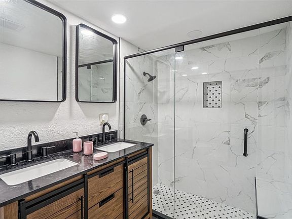 Modern lightingSpacious backyardOpen floor planHard surface countertopsPaver drivewaySleek glass-enclosed shower