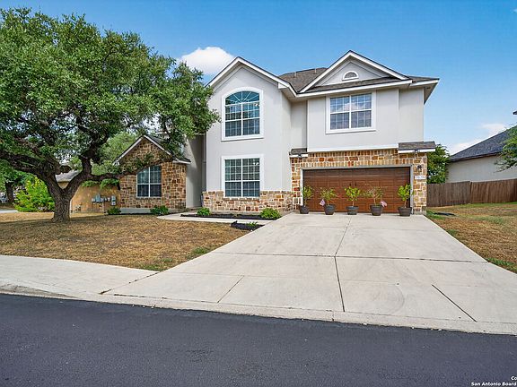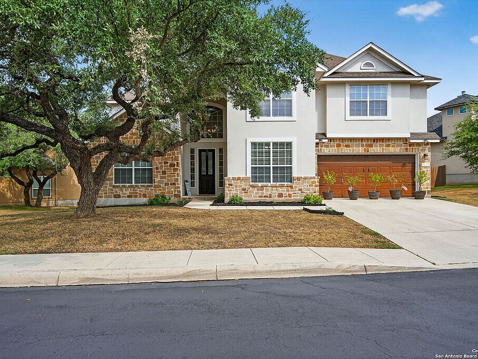 Welcome to 2639 Amber View, an exquisite two-story masterpiece nestled in the prestigious Trinity Oaks Community. This luxurious residence features five spacious bedrooms and five-and-a-half elegantly designed bathrooms, offering comfort and sophistication at every turn. Two private master suites on the first floor boast soaring tray ceilings, expansive walk-in closets, and spa-like bathrooms. An office/study on the main level provides the perfect space for working from home. Upstairs, you'll find three additional bedrooms, a large game room, and a bonus room that can serve as a media room or a sixth bedroom. The gourmet kitchen is a chef's dream, featuring granite countertops, stainless steel appliances, double oven, microwave, and a gas range. Additional highlights include a huge laundry room and food pantry. The Trinity Oaks Community offers exceptional amenities, including a sparkling pool, a charming playground, BBQ grills, and a grand pavilion for hosting unforgettable events. The property is gated, features a pool and park, and has no city taxes. Located in Comal ISD, it combines luxury, convenience, and an unbeatable community lifestyle. Experience modern living at its finest at 2639 Amber View, where every detail has been thoughtfully curated to provide an unparalleled living experience.