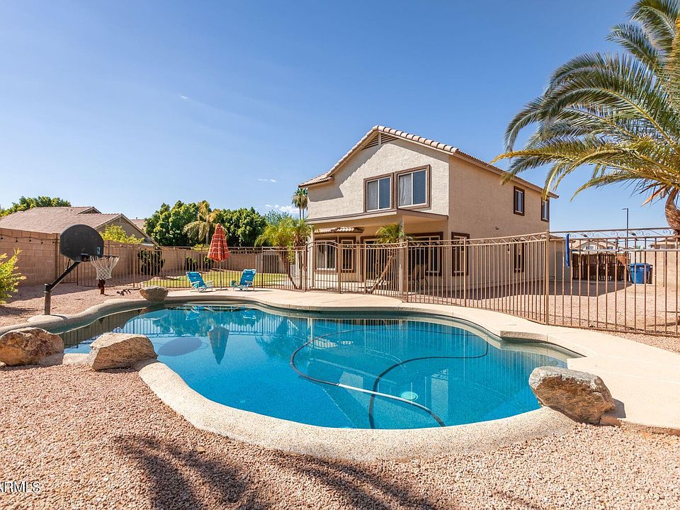OVERSIZED LOT! This home sits on OVER 1/4 OF AN ACRE on a cul de sac lot, and features a full bed/bath downstairs, has 2 NEW HVAC UNITS, a NEW ROOF, RV gate, upgraded baseboards, laminate plank wood and tile floors, NEW water heater and garbage disposal, high vaulted ceilings, an informal and formal living area and dining areas. The open kitchen features a breakfast room, upgraded and extended shaker cabinets, granite countertops, a spacious island, a vent hood and glass backsplash. The master has a full en-suite bathroom that is brand new/fully upgraded and has a separate tub/walk-in shower and granite countertops! The back has a covered patio, huge grassy area, mature lemon and orange trees, and a fenced in private pebbletech pool!