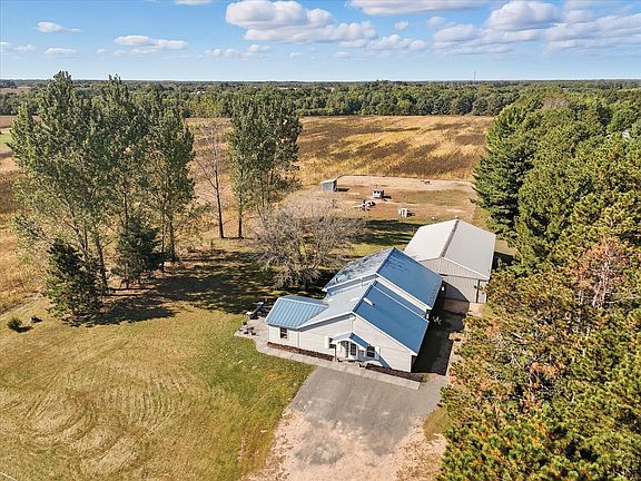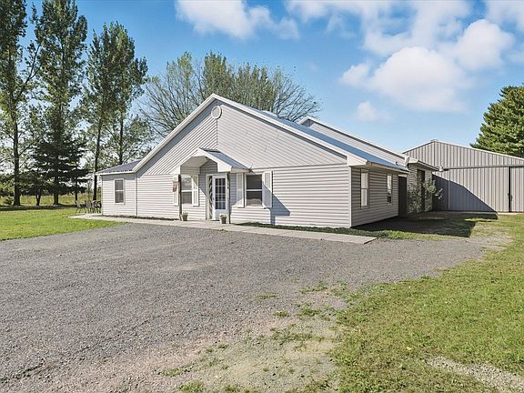 Welcome to this beautifully updated country home set on 20 acres, offering the perfect blend of comfort, functionality, and outdoor enjoyment. This one-level residence features an open floor plan with vaulted ceilings, skylights, and modern finishes throughout. The kitchen stands out with a tiled center island, gas range, over-mount hood, and ample storage, while the adjoining dining and living spaces make entertaining seamless. The home includes two bedrooms a flex room and and a fully remodeled bathroom (2024) featuring a new tub and surround, modern vanity with marble countertop, updated toilet, and custom cabinetry for added storage. Large windows and skylights flood the interior with natural light, and a cozy four-season sun room provides panoramic views of the property year-round. Step outside to enjoy a stamped concrete patio with stone accents, perfect for relaxing or hosting gatherings, all while overlooking the wide-open acreage. For hobbyists or those needing extra storage, the property offers a insulated and heated attached 4-car garage plus a massive 63x39 pole shed.