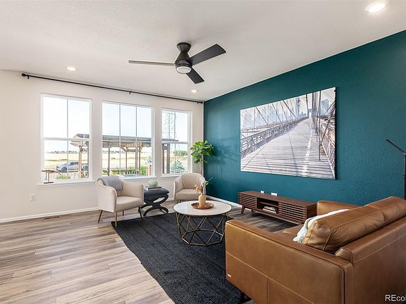 This beautiful 3-bedroom, 3-bathroom home in the desirable Adonea subdivision, boasts a perfect blend of modern elegance and cozy comfort. As you approach, you'll be greeted by a charming covered front porch, perfect for relaxing and enjoying the neighborhood. The 3-car garage provides ample space for vehicles and storage. Step inside the foyer to find luxury vinyl flooring, high ceilings, and an abundance of natural light that creates a warm and inviting atmosphere. The open floor plan seamlessly connects the kitchen and living room, making it ideal for both daily living and entertaining. The kitchen is a chef's delight, featuring granite countertops, stainless steel appliances, and a large walk-in pantry. A convenient powder room on the main level adds to the home's functionality. Upstairs, the primary suite is a true retreat with a huge walk-in closet and an ensuite bathroom. Two additional bedrooms and a full bathroom complete the upper level, offering plenty of space for family and guests. The unfinished basement is a blank canvas, ready to be customized to suit your lifestyle and needs. Outside, you'll find a large fenced-in backyard that backs up to open space complete with a pergola and hot tub. A concrete patio provides the perfect spot for entertaining and enjoying the beautiful Colorado weather. This community features low HOA and includes a pool, clubhouse, park, and playground! Located near E-470 and I-70, getting around is a breeze! Don't miss out on this turnkey home!