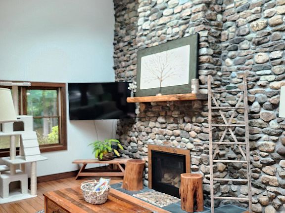 ***Multiple Offers with a deadline of 5PM Saturday. *** Such a unique home! This contemporary style home has an Adirondack flair inside with exposed beams. The home was completely renovated from the foundation up due to a fire, so it has an effective age of only 4 years old. The dramatic 2 story stone fireplace is the focal point of the living rm. Breakfast bar in the kitchen is open to a dining room. and has a pantry around the corner. Basement is finished with a family room and a separate small TV area that could be another bedroom with little effort. Sweet front porch and large rear deck overlooking nothing but nature. All of this is nestled on a wooded 7+ acre lot that offers privacy, peace and quiet.