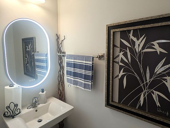 Modern kitchen with islandStainless steel appliancesFreestanding tubDouble vanity