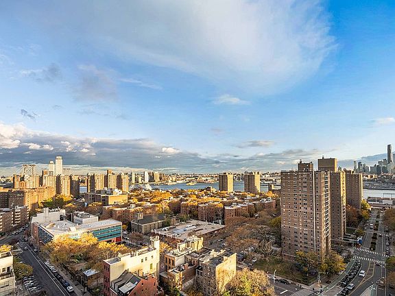 Spacious 19th floor one bedroom with incredible southeast facing views to the East River, Williamsburg and Manhattan Bridges, Downtown Brooklyn skyline and beyond! Enter via a gracious foyer and be ushered into the expansive living room featuring an entire wall of southeast facing windows opening to your own private balcony that runs a full width of the apartment! A lovely dining alcove off the living room, l offers sunny double exposures and a custom window seat. Windowed kitchen in white cabinetry complemented by stone counters and vintage NYC style hexagonal black and white floor tiling. The bath, also windowed, is done in soothing marble tiling accented by a lovely mosaic tile border and features a huge walk-in shower with custom glass enclosure and a classic pedestal style sink. The generously proportioned bedroom can easily accommodate a king or queen size bed, offers three closets for excellent storage, and has two northeast facing windows with a custom window seat. Many other thoughtful features including custom built-ins, granite tile and crown molding. Dogs permitted with registration.
