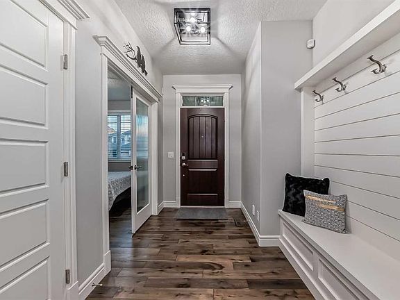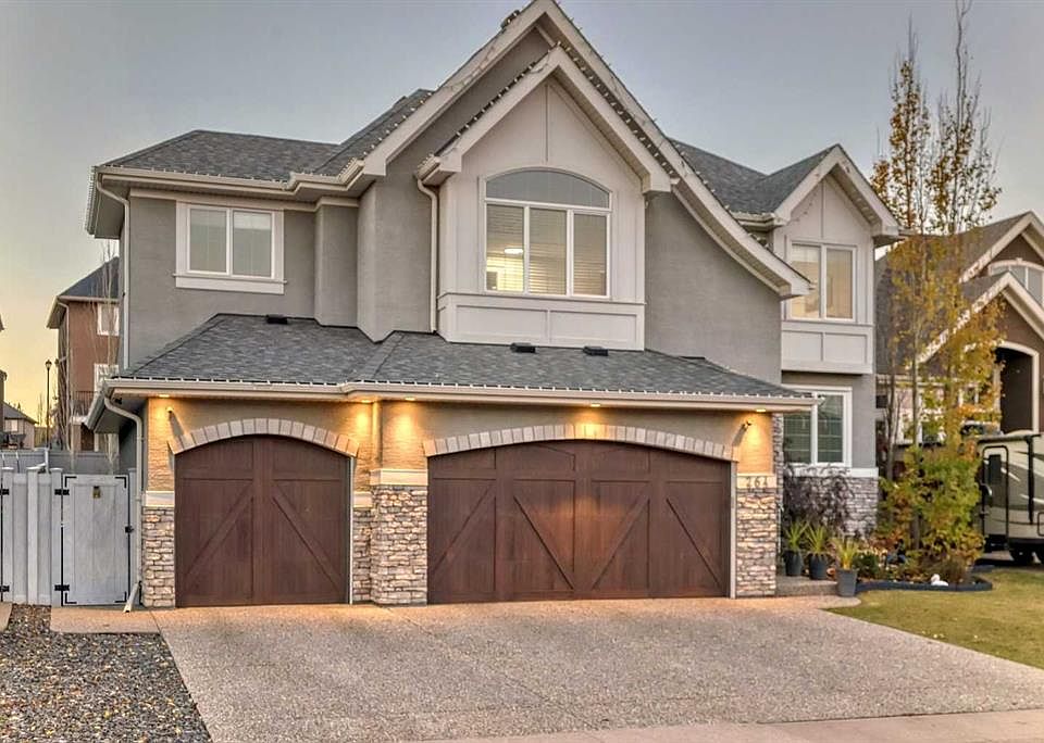 Welcome to this stunning executive home featuring a triple car garage and over 4,098 sq. ft. of beautifully designed living space. With 5 bedrooms, 4 bathrooms, and a main floor office, this residence is nestled on one of Chestermere’s most tranquil and sought-after streets. This home is loaded with high-end finishes and thoughtful upgrades, including new carpet, rich hardwood floors, granite countertops, upgraded and recessed lighting, and a chef’s kitchen outfitted with premium built-in Bosch stainless steel appliances. Additional features include two air conditioning units, central vacuum, built-in speakers, CCTV security cameras, a heated garage, and an exposed aggregate concrete driveway. As you step through the front door, you’re welcomed by a spacious foyer featuring a built-in bench and coat hooks. Just off the entry is a beautifully designed home office, perfectly placed for privacy and productivity. The main floor boasts an open-concept layout ideal for entertaining. The family room offers plenty of seating space and a cozy gas fireplace with a floor-to-ceiling stone surround. The chef’s kitchen is a dream, featuring Bosch built-in stainless-steel appliances, a gas cooktop with a custom hood fan canopy, granite counters, and a kitchen island with a built-in bar fridge for extra beverage storage. A walk-through butler’s pantry with a prep sink provides additional storage and connects seamlessly to the mudroom, which includes built-in cabinetry, a bench, and coat hooks. The dining area is located at the back of the home, filled with natural light from large windows and providing easy access to the backyard. A conveniently located 2-piece bathroom completes the main level. The backyard is a true outdoor retreat with a covered deck, a generous grassy area with mature trees, and a stamped concrete pathway leading to a separate patio with seating around a cozy fire pit — ideal for relaxing or entertaining guests. Upstairs, you'll find four generously sized bedrooms, each featuring custom-built walk-in closets. A bright and spacious bonus room with vaulted ceilings offers additional space for relaxation or play. The luxurious primary suite is the ultimate retreat with tray ceilings, a spa-inspired 5-piece ensuite that includes dual vanities, a freestanding soaker tub, a custom tile shower with bench, and a massive walk-in closet with custom built-ins. A full 4-piece bathroom and a well-placed laundry room complete the upper level. The fully finished basement is designed for entertaining, with 9-foot ceilings and a large open family and recreation area. A stylish wet bar includes an island with a fridge, stove, and dishwasher — perfect for hosting. The lower level also features a fifth bedroom and a modern 3-piece bathroom with a custom walk-in shower.