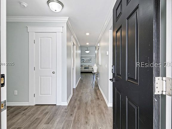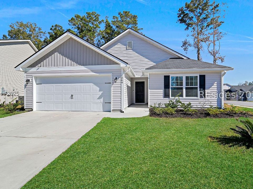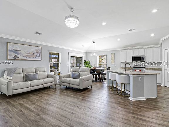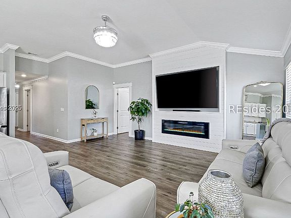 This beautifully upgraded home stands out with custom trim and details rarely found in Heritage at New Riverside. Featuring 4 spacious bedrooms and 2 modern bathrooms, the open-concept design makes every square foot feel bright, comfortable, and functional. Enjoy high ceilings, LVP flooring throughout, and a custom fireplace with TV included, all adding warmth and character to the main living area. The washer, dryer, and refrigerator convey, making this home move-in ready. The primary suite features a custom-built closet, and the peaceful corner lot offers added privacy and a screened porch perfect for relaxing or entertaining. Residents enjoy access to resort-style amenities including a zero-entry pool, clubhouse, fitness center, and scenic 3.4-mile walking trail. Conveniently located near schools, shopping, and dining, this home offers the best of Lowcountry living.