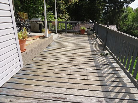 Convenient Country Location! This Charming Raised Ranch on over an acre lot is waiting for you! Enjoy Gorgeous views of the hillsides from your partially wrapped around Deck. The Main Floor features a raised angled vaulted ceiling design through the Kitchen with an open floor plan to the Living Room. The Kitchen boasts wood cabinets, ample size walk-in pantry, island with a gas cooktop, plus an extra tiled Peninsula added to the designated Dining Area. The Living Room is embellished with tile flooring, has an abundance of natural sunlight, and access to out back through the glass door.3 Bedrooms and a Full Bath with shower and jetted tub round out this floor. A spiral staircase will take you into the portion of the Basement that has recently been used as the game/rec room. Also in the Basement is a ¾ Bath with shower, heat system, storage space, potential for a Workshop area, Laundry, etc. and access to your 1 stall Garage. The exterior BONUSES include: Fenced In Backyard to enjoy, Swimming Pool with Deck, and a covered Pavilion/Patio for outdoor enjoyment. There is access to pull a vehicle up into the backyard if so desired. Make your appointment to see this one before it’s gone!