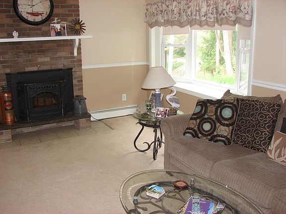 Beautiful ranch on a gorgeous one acre (almost) lot that features a flat backyard, vegetable garden, chicken coop (if you want it) and circular drive that leads to your two car garage! The inside is just as impressive with its updated kitchen and living room that connects to the three season porch. The home offers two bedrooms, each with a double closet and hardwood floors, and the finished basement, with its own exterior access and kitchenette, offers either a family room with fireplace and brand new full bathroom or use it as a master suite, teen suite, etc. There are so many possibilities! Many updates have been made in the past few years some of which include: new windows, hot water tank, roof, new bathroom, attic insulation and deck. Some other bonuses include: Central AC, whole house fan and pellet stove insert. This home offers so much and it is bound to hit a lot of 'must-haves' on your checklist.