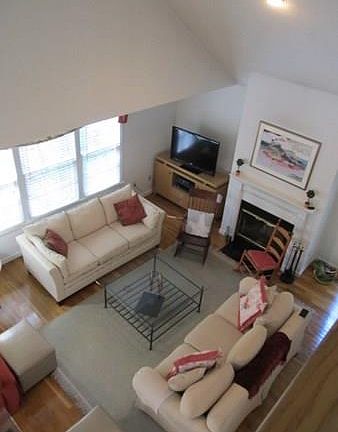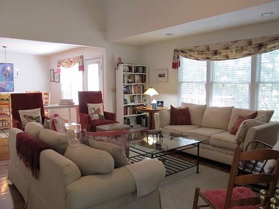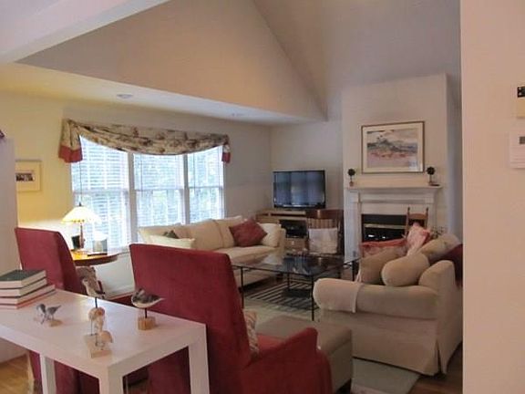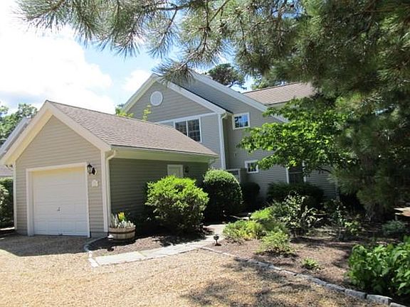 Attractive end unit in Tashmoo Wood, a 105 Acre wooded site in West Chop area of Vineyard Haven. Enter the home through a garden path, into Living room w/high ceilings, wood burning f/p, lots of light. The large dining room can seat 10+ easily. Spacious kitchen with breakfast counter & pantry. On this floor also a cozy den and full bath w/shower. Beautiful hardwood flooring thruout this level. Upstairs are two master bedrooms with ensuite baths, one with soaking tub & separate shower, the other full bath w/shower; laundry facilities. There is deck from the kitchen & a private deck off the dining room. The oversized one-car garage has lots of shelving. Storage/trash closet and outdoor shower. In excellent condition. Never rented; original owner. Assn.amenities include swimming pool, tennis courts, childrens play area and half court basketball, small boat landing on Lake Tashmoo, for your kayaks, canoes & small sail boats; private Assn. beach .Abuts Mink Meadows Golf Course.