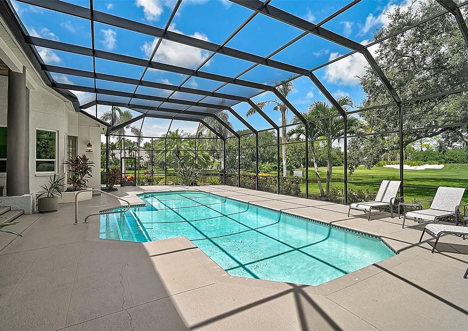 **BRILLIANTLY DESIGNED AND RENOVATED, CUSTOM GOLF COURSE ESTATE with SPECTACULAR WATER and GOLF COURSE VIEWS** is situated on the 8TH Green complex of the Interior HERON GOLF COURSE and is located on a tranquil, 0.59 Acre cul-de-sac lot behind the Secure Gates of The Oaks Country Club neighborhood. Featuring 4 Bedrooms PLUS Large Study/Den, 3 Full and 1 Half Baths, this Open Floorplan with Soaring Ceilings, Custom Built-Ins, Crown Moldings, Engineered Hardwood flooring and discerning architectural details throughout is ideal for entertaining both inside and out! The Impressive NEW Kitchen features Quartz Counters, Premium Stainless Steel appliances including Wolf and Subzero brands, and Large Island with seating area. The Expansive Primary Bedroom Suite entails a Bonus sitting area, multiple walk-in closets with custom built-ins and spacious bath with dual vanities, custom-tiled shower and large soaking tub. Oversized Guest Bedrooms in a private guest corridor are ideal for hosting your family and friends. Incredible Outdoor Entertaining area features a large, covered seating area and Heated Pool in an Expansive, Screened Lanai with an Ideal Southwestern Exposure. NEWer ROOF (2019), Hurricane Impact Windows & Doors (2020-2021), NEW Laundry Room and Much More! THE OAKS is a distinguished, 24hr Guarded, Country Club Community which boasts many accolades including: Platinum Club of America, Emerald Club of the World, Elite Distinguished Club of the World and One of America’s Healthiest Clubs - where amenities include Three Restaurants, Ballroom, Two 18-hole championship GOLF courses, award-winning RACQUETS program with 12 Har-Tru Hydro-Grid TENNIS courts, 4 PICKLEBALL Courts, wonderful CROQUET facility, state-of-the-art FITNESS center and junior Olympic, heated community SWIMMING POOL, Bocce, Basketball Court, Playground and more! The Oaks is just minutes from nationally ranked Pine View School, the Legacy Bike Trail, area Beaches and all that Gulf Coast living has to offer. Membership is required and there is NO WAITLIST for GOLF or SOCIAL Membership. **PLEASE ENJOY VIEWING THE 3D VIRTUAL TOUR and AERIAL VIDEO**