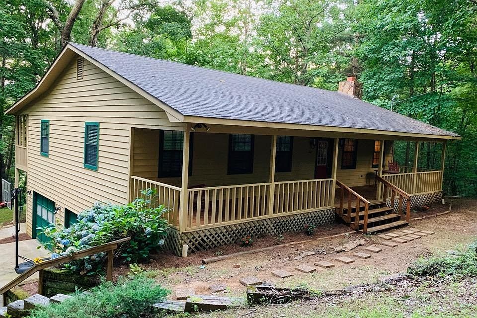 Lake front home in Buckhorn Estates; 3 BR / 2 Ba. on 1.83 ac in highly sought after mountain community, centrally located between Blue Ridge & Ellijay offering all paved roads, quiet atmosphere, river park, small lake, and Whitepath golf course. Greatroom living & kitchen area, stone fireplace w gas logs, country kitchen, and dining nook. 2 bedrooms on main, w Master suite & prvt bath. Full basement has 2 car garage, family room w masonry FP, 3rd BR, great storage or future workshop. Covered front porch and back porch with the beautiful private lake in back. Driveway is steep but paved and year round access. Low HOA $175 yr/ per lot
