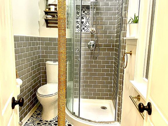 Bathroom is themed with classical, 1920’s style décor. Key features include a Kohler rainfall shower within a 34” shower stall, a slender Kohler lavatory and elegant vanity with beautiful brass-framed mirror and Hickerson brass 3-light vanity lighting. All of which is set in a Spanish porcelain black and white patterned floor tile, paired with glossy grey ‘retro subway’ wall tiles.