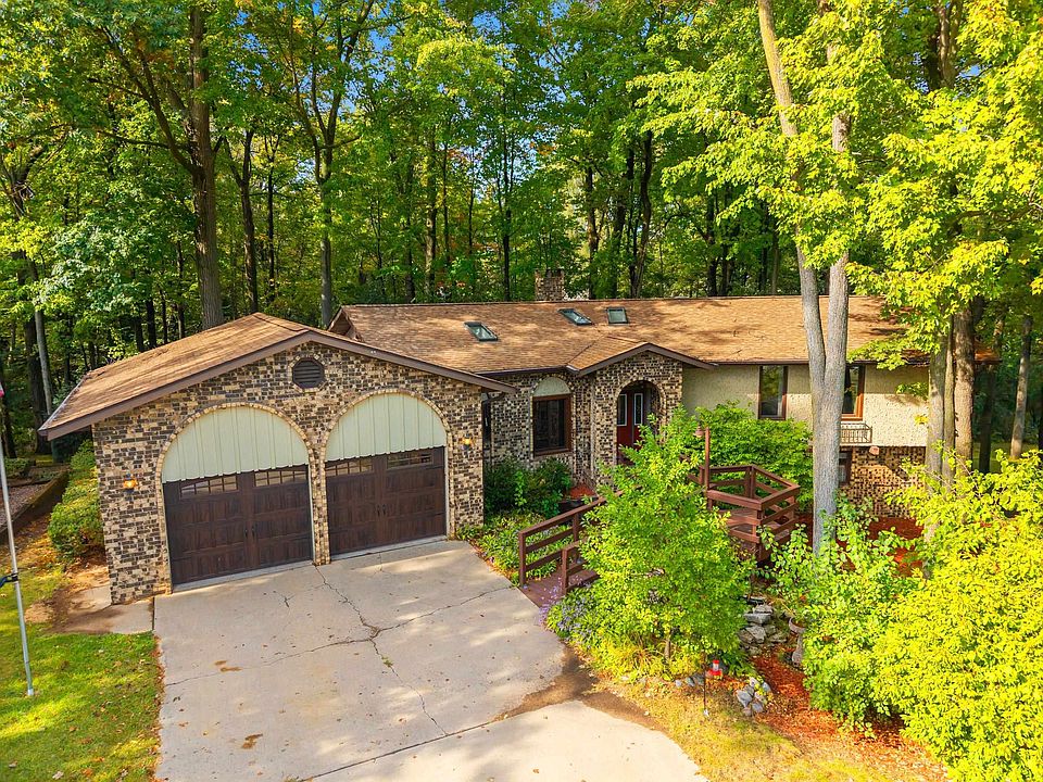 Looking for a home with an interesting architectural design? You will love the vaulted and beamed ceiling, clean lines, minimalist aesthetic, abundant natural light, all while highlighting the cozy and rustic contrast. Scandinavian modern style which prioritizes simplicity, functionality and connection to nature with the wooded backyard with flowing creek, waterfall and koi pond in front yard. This three/four bedroom, 2 ½ bath home with updated furnace, central air, garage doors, kitchen, some windows & more is sure to please! Nice sized deck for viewing nature in the backyard. Close proximity to Lambeau Field, dining & shopping. This home is being sold As Is, Where Is to settle an estate.