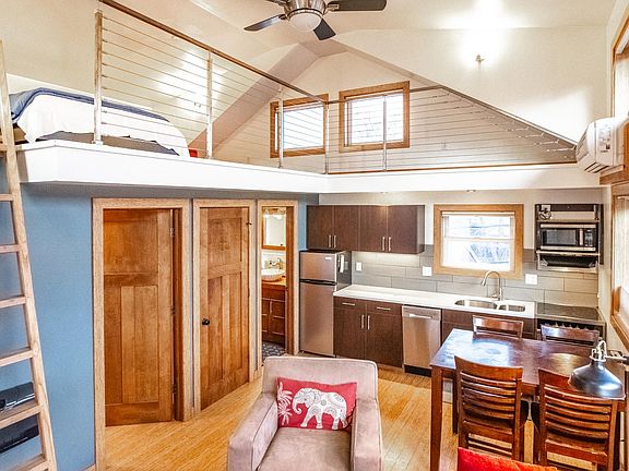 Inviting, sunny, two-bedroom home in a quiet neighborhood close to everything in Boulder! Built in 2012 above the garage, this is a detached, free-standing house with separate gate entrance to private fenced-in yard and private deck, and includes an off-street parking space. Inside is a modern, efficient kitchen with all the necessities- stove, dishwasher, apartment fridge, and microwave. Open floor plan has vaulted ceiling in kitchen/ living room with expansive windows offering lots of southern sunshine. Loft bedroom features a queen bed and comfy chair accessible by ladder. Main bedroom downstairs also has full closet and queen bed. High speed internet to work from home, smart TV, pull-out desk and comfy lounge chair and sofa bed. Centrally located in a quiet residential neighborhood, walking distance to Whole Foods, 29th St. markets, and a 15-minute bike ride to Downtown Pearl St. and the University. We even provide two cruiser bikes so you can get around like a local! Ideal for parents visiting CU, or exploring the Rocky Mountains. Digital nomads and remote workers will find this house the perfect place to stay connected from a sweet residential neighborhood in a lively town.
