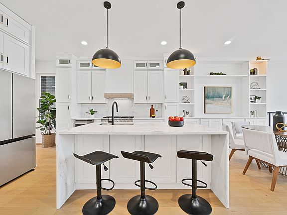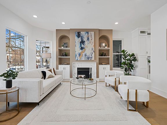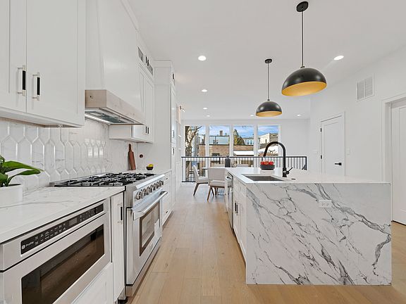 Don't miss the chance to own this exquisite, brand-new single-family home in the heart of Logan Square. This 5-bedroom, 3.5-bathroom residence masterfully combines modern luxury with timeless charm. As you step inside, you're greeted by an open, light-filled living space featuring stunning white oak hardwood floors, custom millwork, and a gas fireplace beautifully framed with a quartz surround and arched built-in shelving. Oversized windows flood the home with natural light, creating a bright and inviting atmosphere ideal for both daily living and entertaining. The chef's kitchen is truly a showpiece, showcasing double-stacked custom cabinetry, a high-end appliance package, and a handcrafted wood-wrapped hood. At its center is a striking quartz waterfall island that adds both elegance and functionality. The kitchen seamlessly flows into the dining area, which features custom built-in shelving for ample storage while maintaining a cohesive, sophisticated design. On the second level, the primary suite offers a serene retreat with cathedral ceilings, decorative wooden beams, and an expansive dressing room. The luxurious en-suite bathroom is a spa-like haven, featuring floor-to-ceiling Calacatta marble tile, a double vanity, and a skylit wet room complete with a soaking tub, a rain showerhead, and a handheld body spray. Two additional bedrooms, a full bathroom, and a laundry room with a side-by-side washer and dryer, complemented by floating shelving, complete this floor. The fully finished lower level provides a versatile space for recreation and relaxation. It includes a spacious rec room with a sleek quartz-topped wet bar and a wine fridge, along with two additional bedrooms and a full bathroom, making it perfect for guests, a home office, or a private retreat. Additional highlights include a thoughtfully designed mudroom located off the rear entrance, an efficient zoned HVAC system, a spacious backyard, and a detached 2-car garage. The home is ideally located just steps from Kosciuszko Park, which features a playground, tennis courts, a fieldhouse, and an indoor pool. It is also within half a mile of the Logan Square Blue Line and the Metra Healy Station, with Logan Square's renowned shops and restaurants less than a mile away. This impeccably designed home offers the perfect blend of luxury, location, and lifestyle. Schedule your showing today and make this Logan Square masterpiece yours!