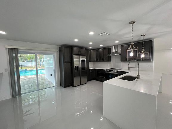 Sleek electric fireplaceScreened lanaiProfessionally renovated living spaceQuartz countersNew appliancesPool accessSpa-style bathroom