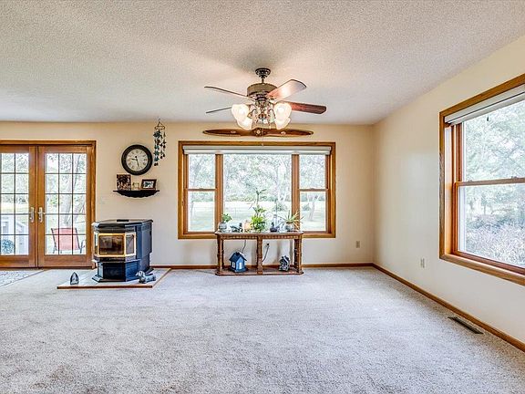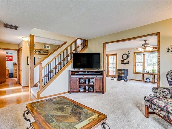 Discover country living at its finest west of Goddard, Kansas. This nearly 4-acre property boasts lush acreage with fruit and walnut trees, a spacious two-story home featuring a 2-car attached garage, plus a detached garage accommodating over 3 cars and a workshop. The seller has excelled in maintaining the property, which includes a water system with reverse osmosis, two wells—one for the residence and one for irrigation—and a new lagoon installed in 2020. The home offers more than four bedrooms with office, three and a half baths, a generous kitchen with granite countertops, an eating bar, and a large dining hearth area. A pellet stove and all existing appliances are included for the new owner, reflecting the home's evident pride of ownership.