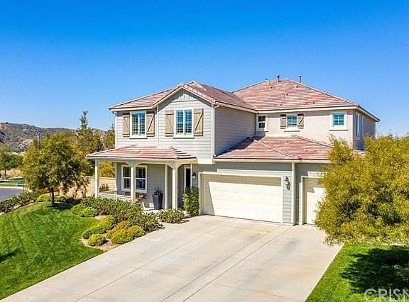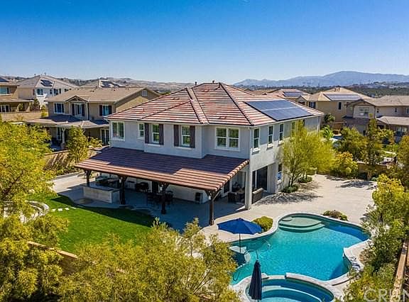 THIS IS IT!!! One of the best lots in all of River Village! This home has it all! Private Pool, Basketball Court, Two Outdoor Gas Fire Places (one with a dug out seating area), Built in BBQ, Patio Overhang running the length of the home, VIEWS FOR DAYS, OWNED SOLAR the list truly goes on and on. Located at the end of the cul-de-sac w/ no rear neighbor & only one neighbor next door. This is PRIVACY at its finest! Enter to a gorgeously updated home with over $200k spent in builder upgrades. Beautiful wainscoting in the office off the entry, engineering hardwood through the downstairs living spaces. Walk into the open concept living and kitchen with an oversized, T-shaped, marble countertop island with plenty of cabinet storage underneath. Off the kitchen is an additional office with built in cabinets a half bath for guests plus another full bed and private full bathroom downstairs. Upstairs you will find and large open loft space. 3 secondary bedrooms, one with its own private bath, and the other two share a large bathroom with a double vanity. Laundry room upstairs has a large storage area plus a sink. The master bedroom has its own private wine fridge and serving area, a separate retreat attached with gorgeous views over the river bed and the hills of Santa Clarita. 3 car garage has built in cabinets on every wall and epoxy flooring. This home you truly have to see to believe. Call us now as this home will not last long!