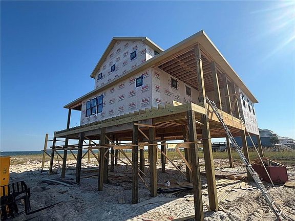 Rental Projections up to $220,000 per year. Estimated completion Spring 2026.  Build updated photos as of 9/2/2025.  This Beautiful Gold Fortified Waterfront Home on the majestic Sound side of Dauphin Island! This 4BD/4BA, 3-story custom home sits on a deep 450’ lot with 80’ of private beach frontage and public Gulf beach access directly across the street.  With over 2,600 sqft of living space, enjoy expansive front and oversized back porches connected for seamless entertaining. Features include an elevator, single-car garage, exterior shower, outdoor bar, and endless opportunities for boating, fishing, and crabbing. The sun deck boasts a stunning infinity pool overlooking the Sound through a glass railing system, with a boardwalk leading to the water’s edge.Inside, the gourmet kitchen stuns with an oversized island, ceiling-height shaker cabinets, quartz counters, walk-in pantry, Samsung BESPOKE appliances, double ovens, 36” electric cooktop, and a fireclay farmhouse sink. The adjacent dining space features a chandelier, and the living room offers a custom shiplap electric fireplace, wet bar, poplar ceiling beams, and picture windows with breathtaking water views.The spacious primary suite includes a fireplace and French doors to the back porch. The luxurious ensuite has built-ins, a walk-in closet, and a custom tile shower and tub. All bathrooms are outfitted with custom cabinetry, quartz counters, and designer tile.The third floor features a soaring 20’ foyer and staircase, a family suite with built-in bunkbeds, and a loft with a private balcony—ideal as a game room, lounge, or 5th bedroom.Additional highlights: 10’ ceilings throughout, hardwood floors, shiplap walls, custom cabinetry in laundry, Nichiha fiber cement siding, standing seam metal roof, Bahama shutters, impact-resistant windows/doors, fans throughout, stained beadboard exterior ceilings, and wooden louvers for privacy. Buyer to verify all information during due diligence.