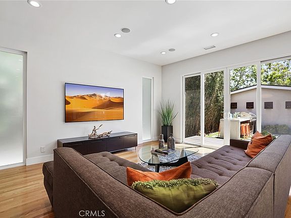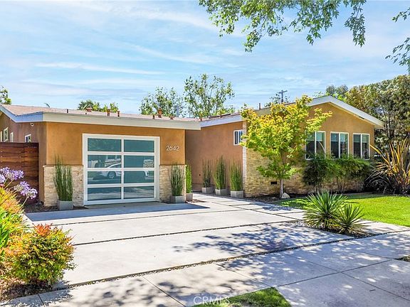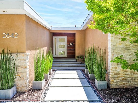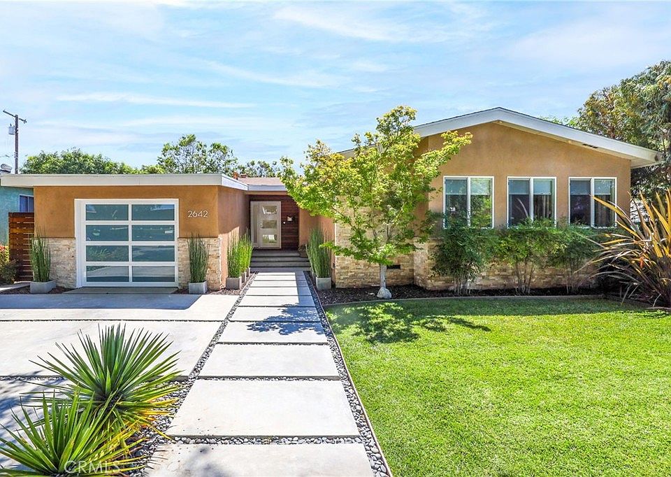 Experience the epitome of luxury in this expanded and remodeled captivating Mid Century Modern vibe spanning an impressive 1980 sqft, 3bed,2bath residence with an office w/built-in cabinets and desk, and the potential for a fourth bedroom. The convenience of an inside laundry room with direct garage access. You'll be greeted by the two-car wide driveway showcasing newer modern concrete work, including a walkway and porch. The Ipe wood fence/gate and Ipe front entry siding, installed in 2017, is a sophisticated touch w/ meticulously landscaped grounds enhance the curb appeal and a wide single-car garage, outfitted with a sleek modern windowed garage door installed in 2020 and Inside the garage, you'll find wood shelving for ample storage and electrical ready for workshop or electric vehicles. The walkway leads to the three glass panel front door, complete with a sidelight, and enter the Great Room boasting 10 ft ceilings. The open floor plan creates a seamless flow throughout the living spaces, complemented by in-ceiling surround sound. Two large 10' wide sliders flood the room with natural light and offer views of the meticulously designed backyard oasis. Here, you'll find speakers, a gas BBQ island, a gas fire pit, a deck, a play structure, artificial turf, and a bamboo perimeter. Inside, the modern kitchen will delight culinary enthusiasts with its large island, Kitchen Aid appliances, 6-burner gas stove, oven and microwave/convection oven, wine fridge, and exquisite cabinets and quartz countertops. The primary suite is a true retreat, featuring a walk-in closet with built-ins and bathroom boasting a freestanding bathtub with a stone accent wall, a skylight, a shower, a double vanity, and a separate water closet. The updated guest/hall bathroom includes a separate tub and shower and is conveniently located near two additional large bedrooms. Notable features include original oak wood floors extended throughout the new and remodeled areas, newer window coverings, recessed LED lighting, shaker doors, a media cabinet, a newer roof from 2011 and 2017, exterior house and landscape lighting, irrigation systems, HVAC system, main electrical panel boasts 200 amps with a 60 amp sub-panel in the garage. Ideally situated across the street from Emerson Elementary, as well as near Millikan High School, El Dorado Park, river trail access, shops and more. Prepare to be captivated by the unparalleled blend of style, comfort, and convenience this home offers.