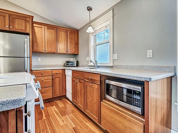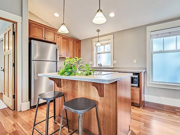 This cozy, furnished apartment sits above the garage with no walls adjoining the main house. There's a private entrance and driveway with one parking spot and small porch to sit and sip your coffee. All the rooms have hardwood floors, vaulted ceilings and large windows to let in that Bend sunshine. There is also a charming gas stove and wall heaters to keep you cozy on the cold days.